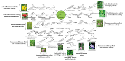 高文远教授课题组长期从事人参属药用植物生物合成途径解析和代谢调控研究。在本课题的资助下,课题组进一步揭示了三七皂苷等4条生物合成途径及代谢调控机理。建立了人参、西洋参和三七3种植物的生物合成基因库,筛选到与皂苷生物合成相关的功能基因206个。对潜在糖基转移酶进行了功能验证,证实了UGTPg71A29、Yjic具有20位葡萄糖基化功能、Cluster-26044.27684具有6位木糖基化功能,揭示了Rg1, Rb1, R2和R1 4条生物合成途径。研究还建立了人参三七土壤和内生菌数据库,获得与人参和三七中有效成分合成道地性相关的菌株F24、B10等7株。发现F24诱导激活的转录因子PgWRKY4X,通过调控靶蛋白PgSE表达,正向调控人参皂苷的积累。两项研究成果为人参和三七皂苷合成生物学及代谢工程研究奠定了理论基础。