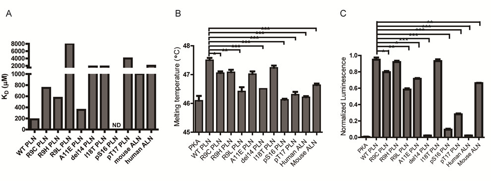 为研究SERCA调节肽受PKA磷酸化调节机制的普适性,作者们对近期新鉴定发现的SERCA调节肽ALN进行了类似相关研究。ALN是一种表达于内质网膜上的单次跨膜蛋白,在包括心肌在内的多个组织器官都有广泛表达。ALN上负责与SERCA相互作用的跨膜结构域在序列上与PLN相对保守,而位于胞质一侧的潜在磷酸化调节位点序列并不保守。实验结果表明ALN可以被PKA磷酸化,然而与PLN相比,ALN与PKA结合的亲和力以及其磷酸化水平均有所下降。