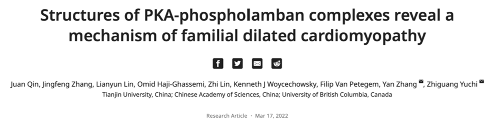扩张型心肌病(DCM)是最常见的心肌病类型,也是造成心脏衰竭的最主要原因之一。在受磷蛋白 (PLN) 中发现的若干突变与家族性扩张型心肌病和心脏衰竭有关,但潜在的分子机制仍不明确。在生理条件下,PLN通过与肌质网钙ATP 酶(SERCA)相互作用调节其钙摄取功能,而这一调节过程本身又受到蛋白激酶A (PKA) 依赖性磷酸化的调节。为揭示PLN的遗传性突变引起心肌病的发病机制,天津大学尉迟之光研究组在eLife杂志发表了题为Structures of PKA-phospholamban complexes reveal a mechanism of familial dilated cardiomyopathy的研究文章。作者通过解析PKA与野生及突变型PLN的复合物蛋白晶体结构,并综合多种生物物理和生物化学方法,对致病突变进行了系统研究,揭示了一种导致扩张型心肌病的常见机制:PLN中的突变通过改变其构象减弱与PKA的相互作用,从而降低PLN的磷酸化水平。作者还发现另一种分布更为广泛的SERCA 调节肽(ALN)具有与PLN相似的PKA依赖性调节机制。