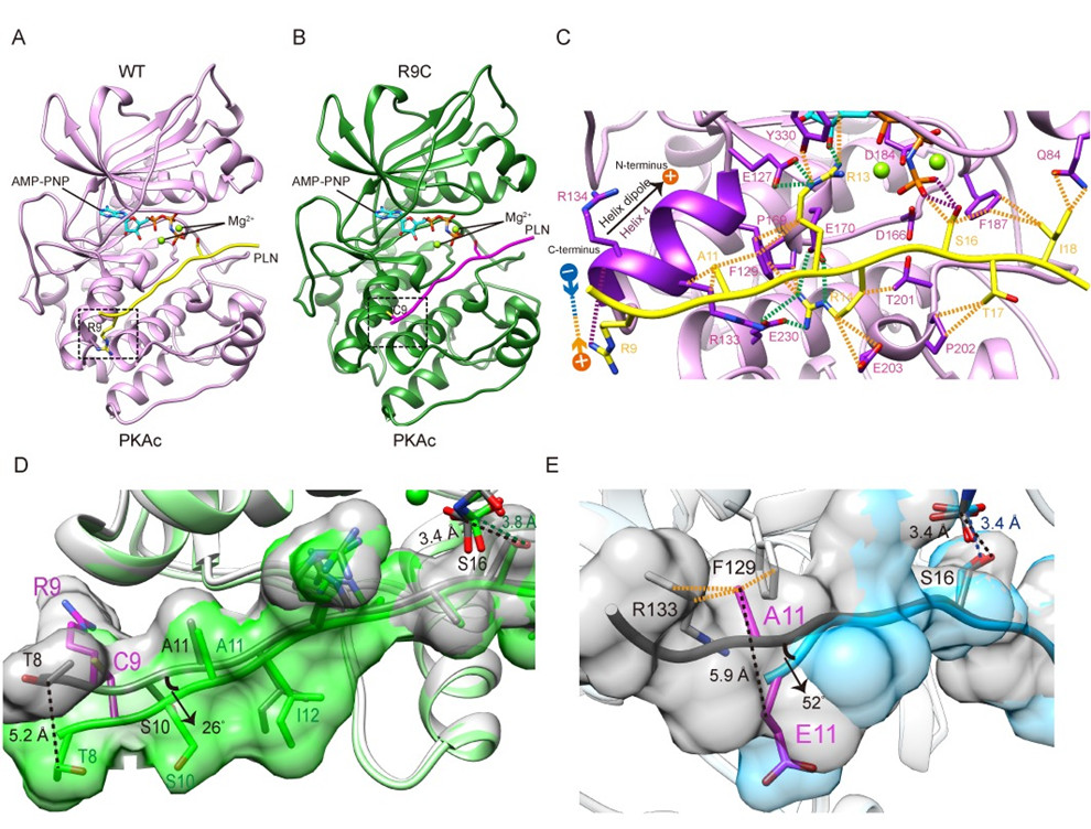 研究团队解析了PKA与野生型及两种突变型PLN的复合物蛋白晶体结构。与曾经解析的PKA:PLN=2:1的野生型复合物结构相比,此次解析的PKA:PLN=1:1的野生型复合物结构更接近其真实溶液形式,揭示了在生理状态下PKA催化PLN底物的方式。团队解析的PKA+PLN A11E复合物晶体结构进一步区分了两种野生型结构模型,并证实了新解析野生型结构的合理性。R9C是表型最严重也是功能研究最为广泛的DCM相关突变,但由于结构信息缺失,其导致心肌病的分子机制仍有争议。团队进一步解析了PKA与R9C突变型PLN的复合物晶体结构,显示R9C消除了精氨酸带正电荷的侧链与PKA结合口袋处带负电的α-螺旋偶极子之间的静电相互作用力,以及与PKA之间的氢键作用,从而使PLN改变构象并远离PKA,最终减弱二者间的相互作用(图1)。
