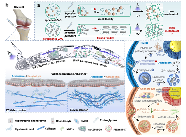 近日,天津大学医学部药学院李楠教授团队在骨关节炎治疗领域取得重要研究成果,该研究开发了一种新型流线型ZnO嵌合可注射水凝胶,该流线型载体独特的流体力学特性,在提升材料可注射性的同时,又通过优化力学性能实现了稳定的支撑功能。通过原位注射调节分解代谢与合成代谢重平衡恢复细胞外基质异常状态,为骨关节炎治疗及软骨再生开辟了新路径。相关论文《Streamlined metal-based hydrogel facilitates stem cell differentiation, extracellular matrix homeostasis and cartilage repair in male rats》发表于期刊Nature Communications。